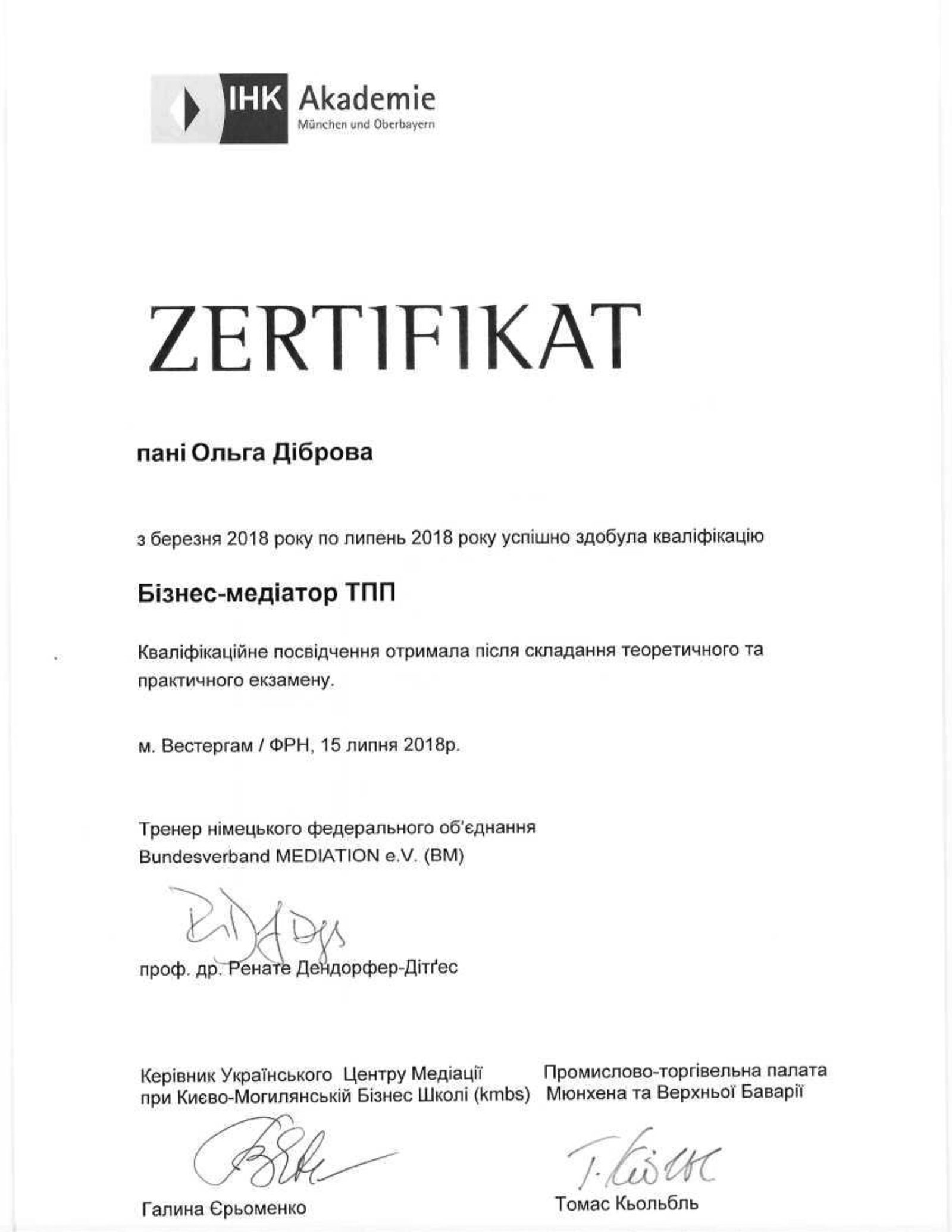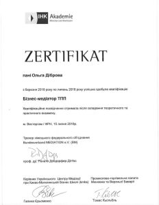 • Сертифікат бізнес-медіатора (Wirtschaftsmediator / in (IHK), Український центр медіації Києво-Могилянської бізнес-школи (kmbs)/ Академія Торгово-промислової палати Мюнхена та Верхньої Баварії),2018
