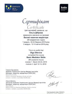 • Сертифікат базових навичок медіатора (Український центр медіації Києво-Могилянської бізнес-школи (kmbs)), 2018