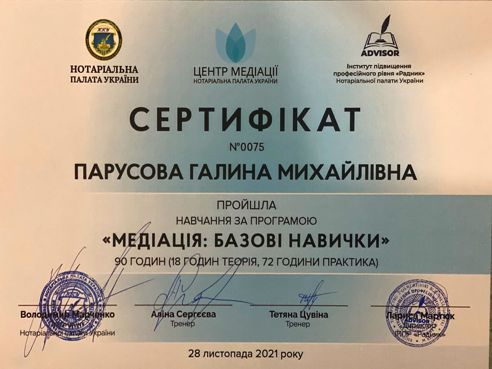 Освіта медіатора: 90 годин, Центр медіації нотаріальної палати України