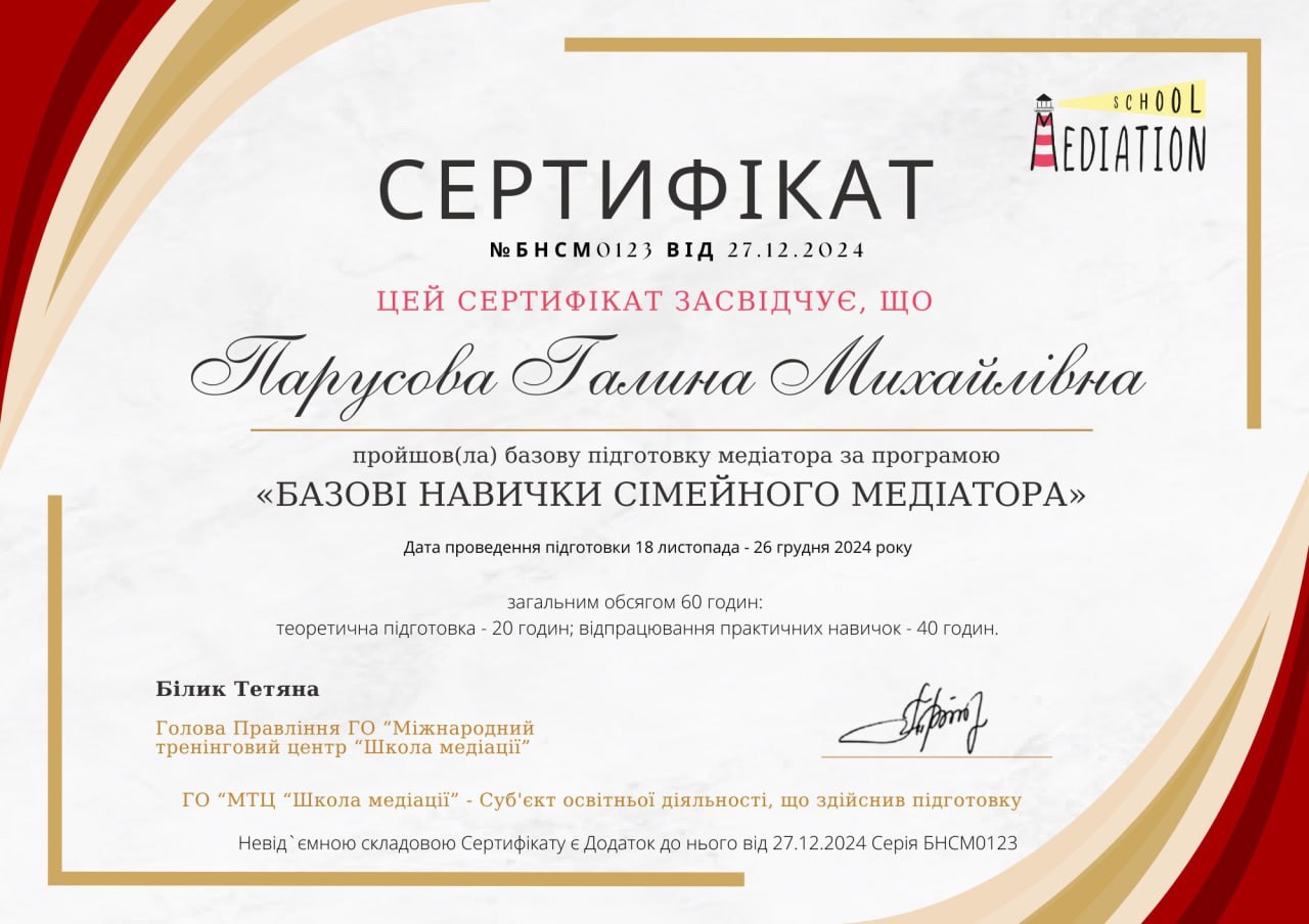 Для зв'язку з цим медіатором надішліть подробиці по ел. пошті parusova_notary@ukr.net