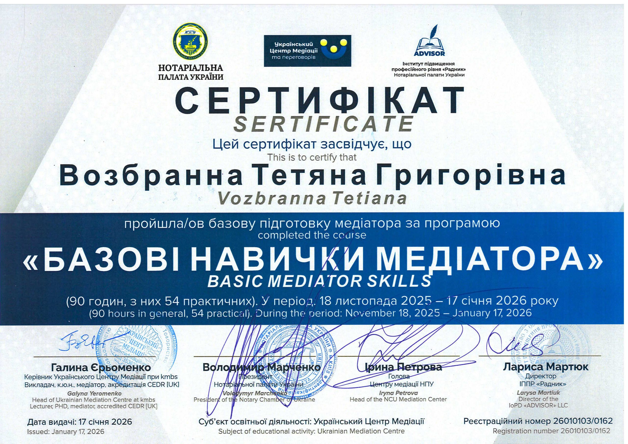 90 годин, з них 54 практичних, Нотаріальна палата України, Український центр Медіації та переговорів, Інститут підвищення професійного рівня “Радник” НПУ